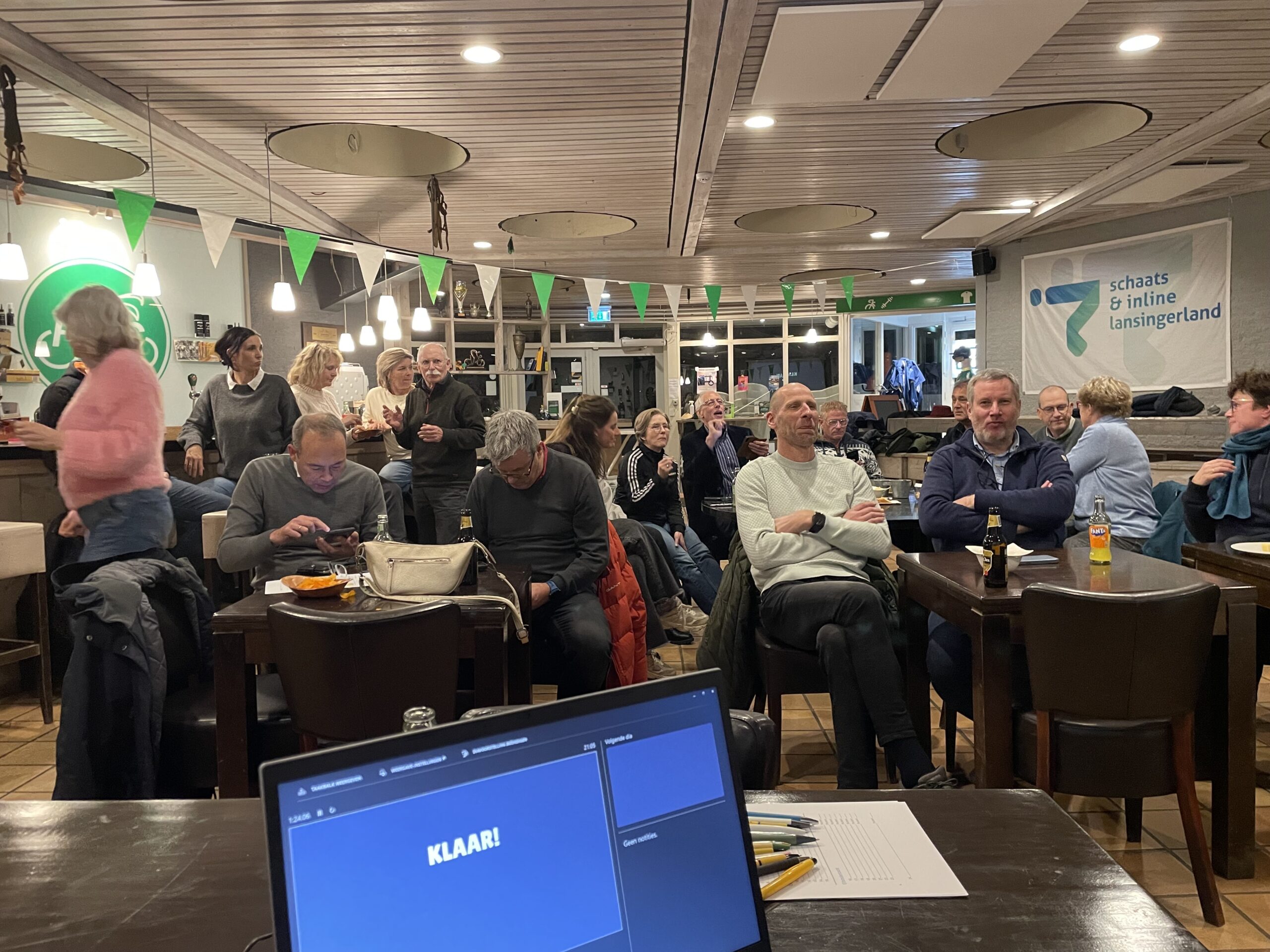 Daarna was het tijd voor de pubquiz met als thema schaatsen. Harry presenteerde deze met veel schwung; gaandeweg werden de deelnemers steeds fanatieker. De vragen varieerden van eenvoudig tot behoorlijk pittig — want hoe dik moet het ijs ook alweer zijn voor een Elfstedentocht, en welke band uit Sassenheim vrolijkt de wedstrijden op met gezellige muziek? Dankzij Ooms en Scildon waren er mooie prijzen te verdelen.